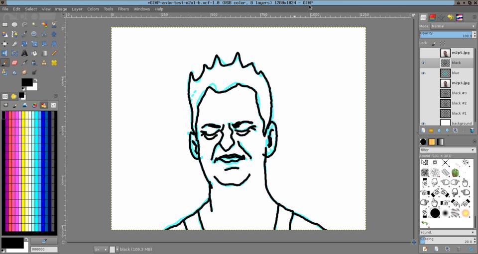 In the example shown in Figure 3, I imported a series of reference photos into GIMP and traced over them in cyan and then in black. I eventually deleted the reference photos and blue layers, leaving only the black-lined drawings that I planned to use for my final animation.