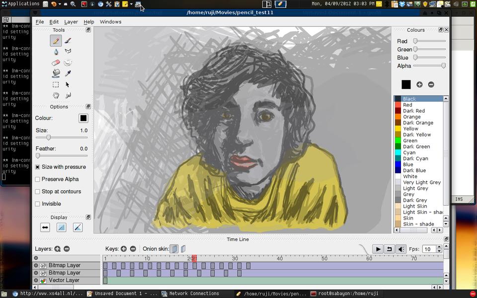 Pencil is a traditional 2-D animation program, which, although still in beta, already fills a gaping hole in the sphere of Linux animation tools. It allows drawing in both vector and bitmap formats as well as importing images and sounds. My trials with Pencil have been basic but mostly satisfactory, although the video export feature appears broken in Linux. I have compensated for that and made some cool videos anyway simply by taking a screen recording during animation playback in Pencil. There is an active community of Pencil users who post animations on the Pencil Web site's gallery. Pencil is similar to Synfig Studio, but I find the interface easier to navigate.