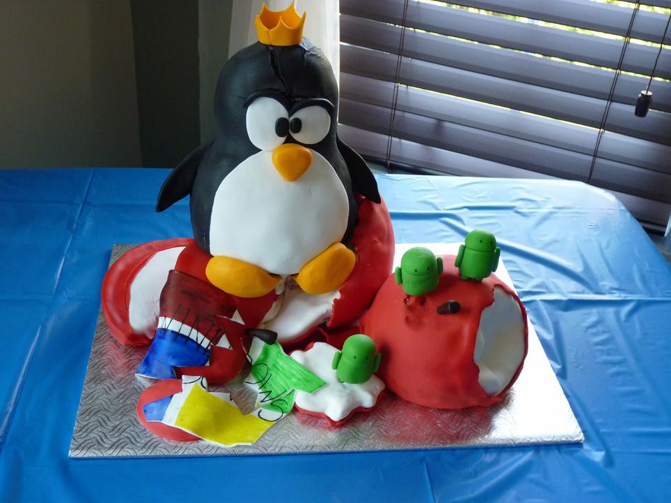 The cake is a big Tux crushing an Apple. On its right is a broken Windows, and on the left, small Androids are eating an Apple.