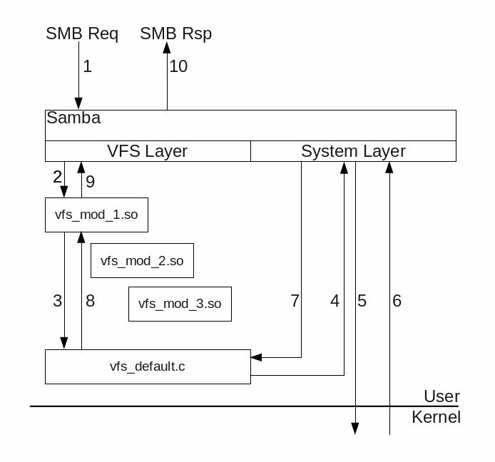 An SMB request is received from the client by Samba and undergoes initial processing within Samba itself. At some point, Samba then calls a VFS function to complete the processing of this request.