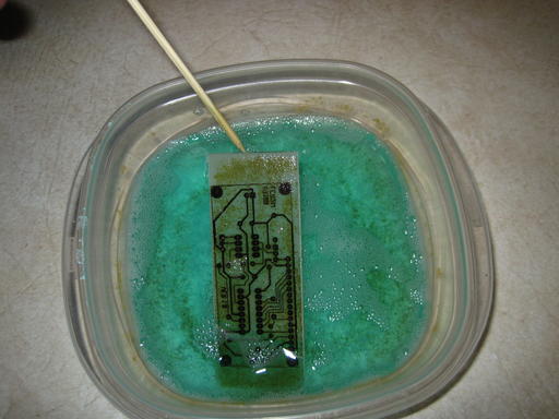 The sponge and ferric chloride method works extremely well, etching the same board in a couple of minutes. In the past, I used ferric chloride to etch boards by placing them into a bath of ferric chloride. Even with agitation, etching a board could take ten minutes or so. The sponge and ferric chloride method accelerates the etching by continuously rubbing the surface with a sponge soaked in ferric chloride. The rubbing removes the oxide layer that continuously builds up, permitting the ferric chloride to get to the raw metal and thus accelerate etching. Instead of a tub of etchant, a couple tablespoons is all you need, which will make a bottle of ferric chloride last for a very, very long time. The technique is simple. Don plastic gloves, pour a couple tablespoons of ferric chloride into a small container, soak a small piece of soft sponge in the ferric chloride, then continuously and lightly rub the saturated sponge on the PCB. In a couple minutes, the board will be finished with little mess and little ferric chloride to dispose of.