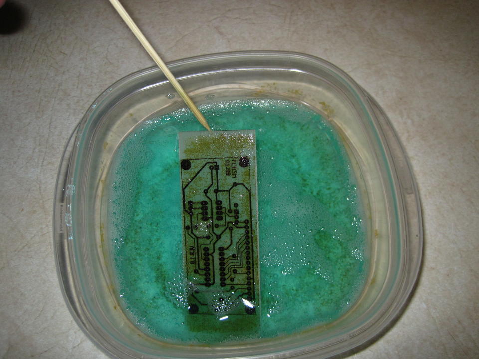 The vinegar and salt method works, albeit slowly. Etching my small board took two hours. The formula I used was equal parts vinegar and hydrogen peroxide and a few tablespoons of table salt. Keep adding salt until the “fizzing” continues all by itself. The liquid starts out clear but then turns an attractive shade of blue (Figure 10).