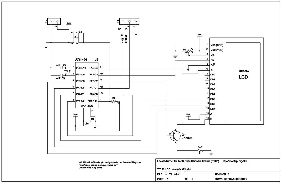 I created two versions of my VT100-LCD project: one using the eight-pin ATtiny85 microcontroller and another using the 14-pin ATtiny84 microcontroller. The schematic for the ATtiny84 microcontroller version is shown in Figure 2.