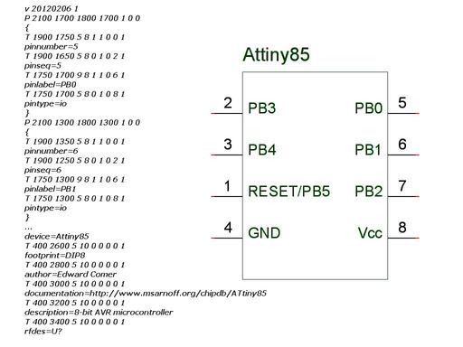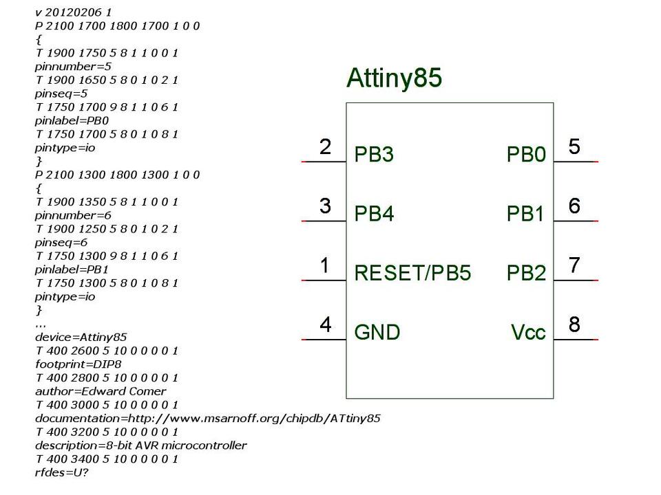 Because some of the components I was using do not exist in the built-in library, I scoured the Internet for contributed symbols, and in a few cases, I had to design my own symbols. A good source for contributed symbols and footprints is gedasymbols.org. For creating your own symbols, see David Weber's Online Symbol Creation Tool at EmbeddedToolBox.com. Symbols actually are text files. Figure 3 illustrates a symbol along with a portion of the text file used to draw it. Symbol files are not just an image. They also hold important pin definitions and the name of the footprint file that the gEDA PCB program ultimately will use to represent the component on the circuit board.