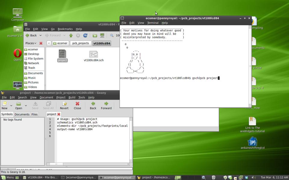 A gEDA schematic is a text file interpreted for GUI presentation by gschem, but it also serves as the source for gEDA's PCB program. An intermediary helper program named gsch2pcb is used to prepare the schematic file for use as input to the PCB program. While xgsch2pcb is a GUI version of gsch2pcb for gsch2pcb, I use the gsch2pcb command-line version. For example, given the schematic file vt100lcd84.sch as an input, gsch2pcb creates vt100lcd84.pcb, vt100lcd84.net and vt100lcd84.cmd, all necessary files for PCB creation. gsch2pcb also displays important instructions as part of its command-line text output. To make the process a little easier, I use a file named “project” in the project folder for the current design. Figure 4 shows my project folder for the vt100lcd84 project, the “project” file and the command line with the gsch2pcb command just before execution.