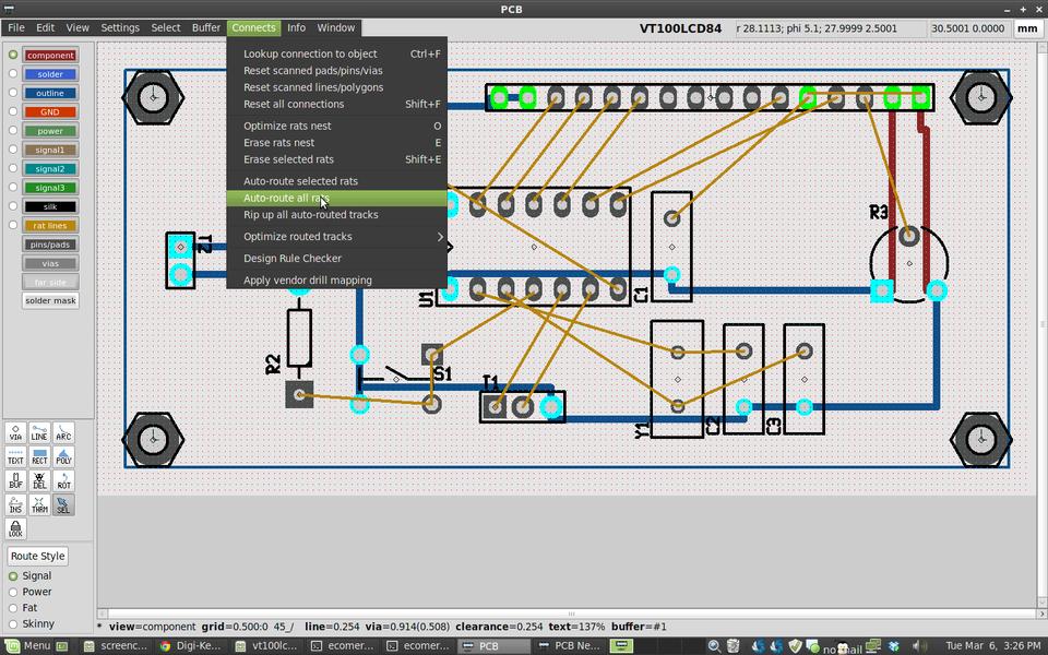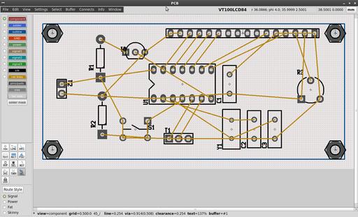 To design the circuitry for the VT100-LCD, I chose gschem of the gEDA Project by geda-project.org. This suite includes not only the schematic design program but also a PCB layout program, as well as various helper programs. A number of schematic/PCB design software programs exist, but I'm focusing on the open-source software of the gEDA Project by geda-project.org here. Other open-source projects that run on Linux, include KiCad, as well as several commercial products, the most popular of which is Eagle PCB by CadSoft, which runs pretty well under WINE.