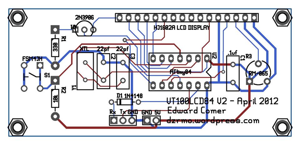 PCB possesses the ability to auto-route the traces, namely convert the “rats-nest” into copper trace representations. This tends to do some odd things but produces a workable PCB design once a cleanup is done. I chose a semi-manual layout so I could control the placement and appearance. Basically, I used the auto-route for the power traces, did some manual cleanup, then used auto-route for the signal traces, followed by more cleanup. The result was similar to Figure 6, which is my second and final version of the layout for the ATtiny84 version of my VT100LCD project. PCB Manufacture Printed Circuit Board layout consists of applying upon a copper laminated board an acid-resistant pattern that represents the areas that are to retain copper after etching in an acid solution (etchant). Areas of the copper laminated board that are exposed to the etchant will be dissolved away, leaving the areas under the acid-resistant pattern intact.