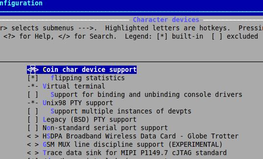 the command-line utility scripts/kconfig/mconf will start and read all the Kconfig files to build a menu-based interface. You then use these programs to update the values of your COIN and COIN_STAT compilation options. Figure 1 shows how the menu looks when you navigate to Device Drivers→Character devices; see how the options for the coin driver can be set.