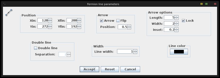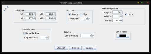 To begin drawing, first select an object type from the left-hand side. The regular particle types are fermions (straight lines), scalars (dashed lines), ghost (dotted lines), photons (wiggly lines) and gluons (pig-tailed lines). In the diagrams, there are four versions of these particle lines: lines, arcs, loops and beziers. Once you select one of those, you can draw on the canvas by clicking and dragging to draw the relevant line. You can draw anywhere on the canvas, or you can force the drawing to snap to grid points. The spacing of these grid points is adjustable in the Preferences. At least in the beginning, you probably will want to turn this on so that you can make the different sections of your drawing line up. Each of the elements of your drawing has properties that can be edited. You need to select the edit tool from the left-hand side, and then select the element you want to edit (Figure 2).