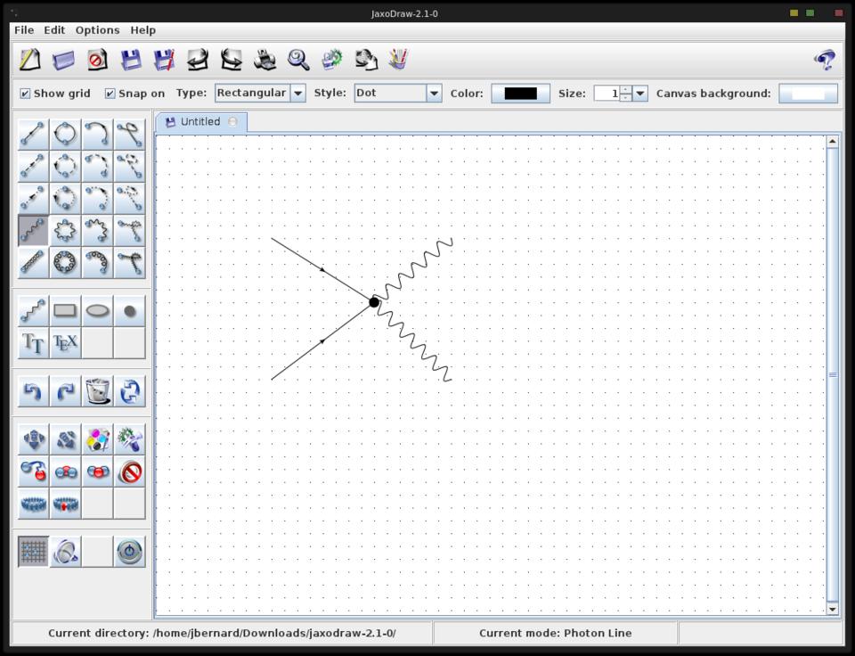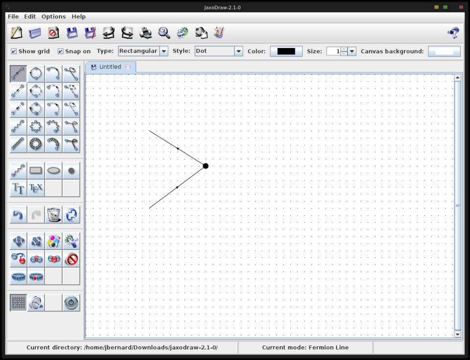 Be aware that currently the GNU Java virtual machine doesn't run JaxoDraw. On start up, you will have an empty canvas and a list of the elements available to draw your Feynman diagram (Figure 1). The left-hand side is broken into several sections, including the types of particles or the types of edits available. JaxoDraw uses XML files to save Feynman diagrams. This way, you can load them again later to make edits or build up more-complicated reactions.