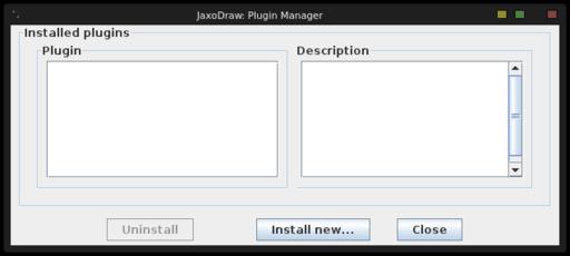 JaxoDraw has a plugin manager to handle installing and uninstalling plugins (Figure 5). You simply have to download the relevant jar file, then use the plugin manager to install it. Plugins are stored at $HOME/.jaxodraw/$VERSION/plugins. If you like, you can install plugins manually by dropping the associated jar file into this directory. To uninstall manually, you can delete the relevant jar file and any corresponding property files from this location.