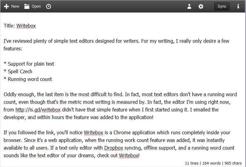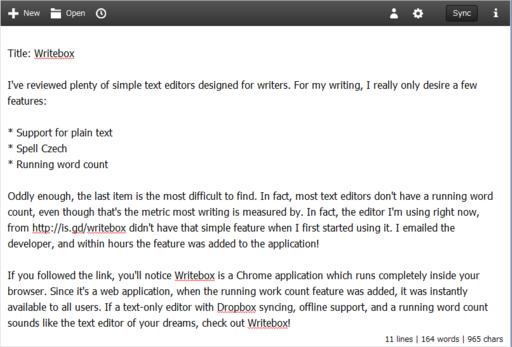 If you followed the link, you'll notice Writebox is a Chrome application that runs completely inside your browser. Because it's a Web application, when the running word-count feature was added, it instantly was available to all users. If a text-only editor with Dropbox syncing, off-line support and a running word count sounds like the text editor of your dreams, check out Writebox.