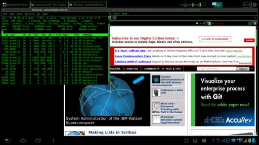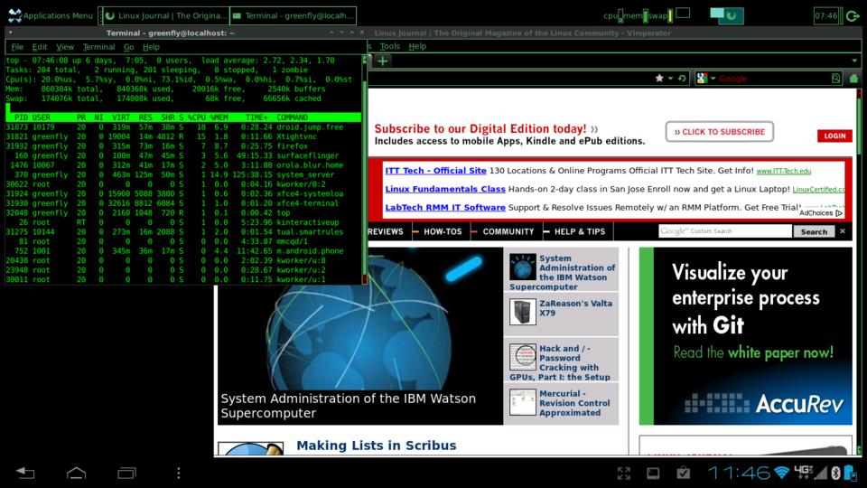 Once I docked the Droid 4, a special webtop mode kicked in and basically took my regular phone desktop and expanded it to fill the new larger screen (Figure 2). What used to be the notification area at the top of the screen now filled the bottom of the screen like a panel, and mouse clicks acted like touchscreen taps. Many native apps took advantage of the larger space and resized as though I were using a tablet. What I realized then was that if I could figure out a way to get a real Linux environment on this device, I may be able to get close to the dream of that dockable computer I could take with me everywhere.
