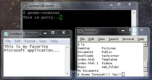 Figure 7. From the top, clockwise: Putty window, GNOME Terminal, Notepad—all running side by side!