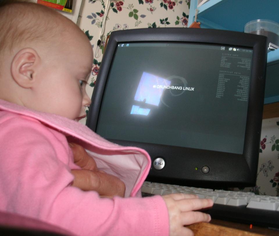 My four-month-old granddaughter, Dylan, getting introduced to CrunchBang