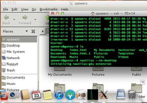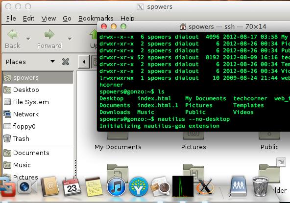 OS X's Terminal app tunneled into a Linux machine, running gnome-terminal, with XQuartz running in the dock.