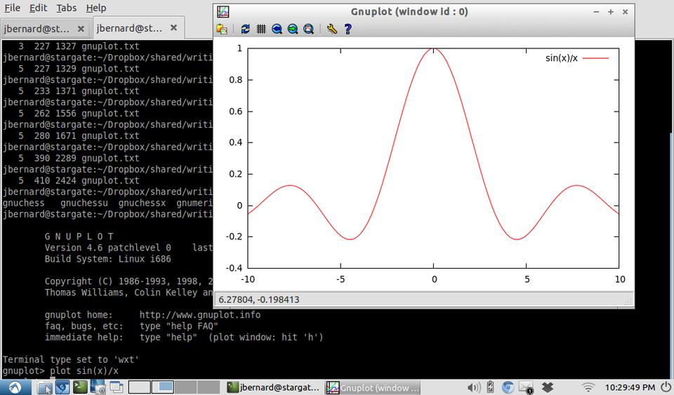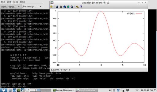 Gnuplot is a command-line-driven program. As such, it has been co-opted to provide graphic capabilities in several other applications, such as octave. Thus, you may have used gnuplot without even realizing you were doing so. You can use gnuplot in several ways. It not only can accept input data to plot, but it also can plot functions. Gnuplot can send its output either to the screen (in both a static file format display or an interactive display), or it can send output to any of a large number of file formats. Additionally, lots of functions are available to customize your plots, changing the labels and axes, among other things.