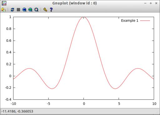 Once gnuplot is installed, you can start it by executing the command gnuplot. When executed this way, you are launched into an interactive session. Let's start by trying to plot a basic function. You should be able to plot any mathematical function that would be accepted in C, FORTRAN or BASIC. These mathematical expressions can be built up from built-in functions like abs(x), cos(x) or Bessel. You can use integer, real and complex data types as arguments to these functions.