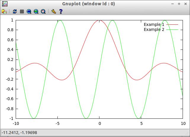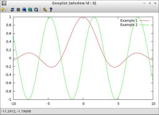 plot sin(x)/x title "Example 1", sin(x) title "Example 2"