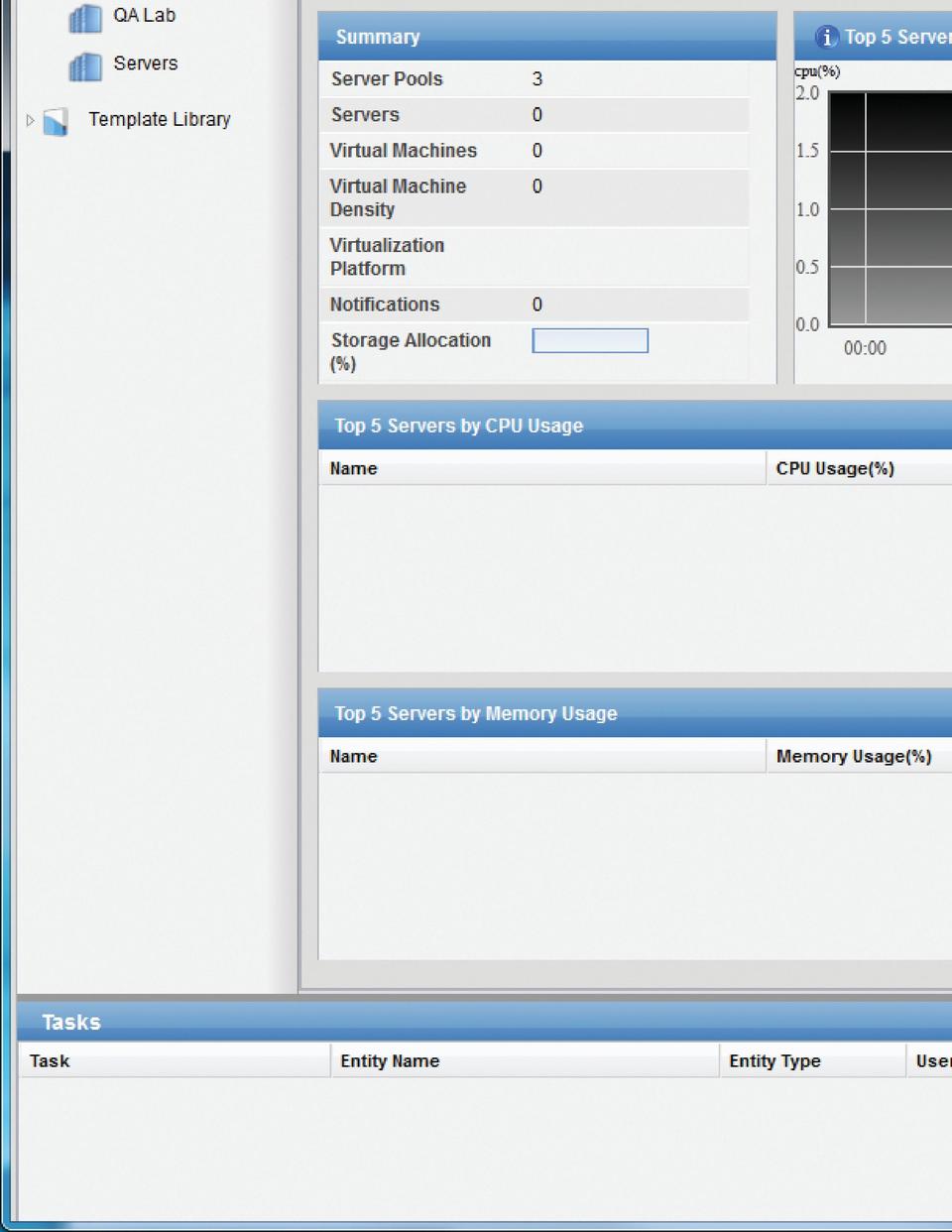 After the CMS install is complete, access your management page at http://youripaddress:8081 (Figure 1). Use the default login of “admin/admin” to bring up the main console. For those used to VMware's vSphere, this interface will feel familiar. The layout is broken into three main panels: a navigation panel on the left, a display panel for selected items in the middle of the page and a panel at the bottom for displaying task results (Figure 2).