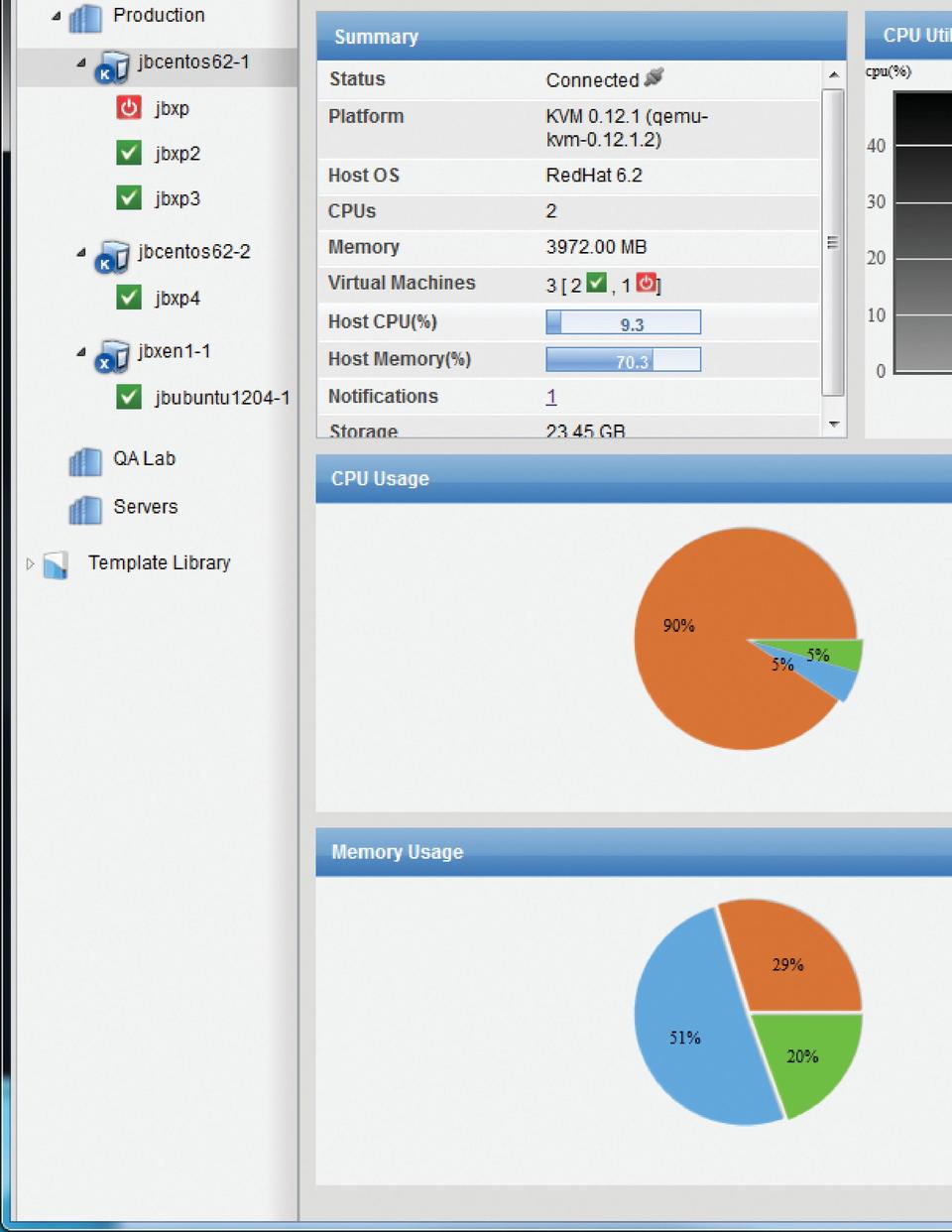 If you have not configured SSH for root access on the host, the server will fail. If the server is added successfully, it now should display under the server pool you chose with a little K (K) or X (Xen) icon (Figure 3). Click on the newly added server to see performance information about your host displayed in the center pane (Figure 4). From this display, you also can view the number, type and status of the guest running on the host.