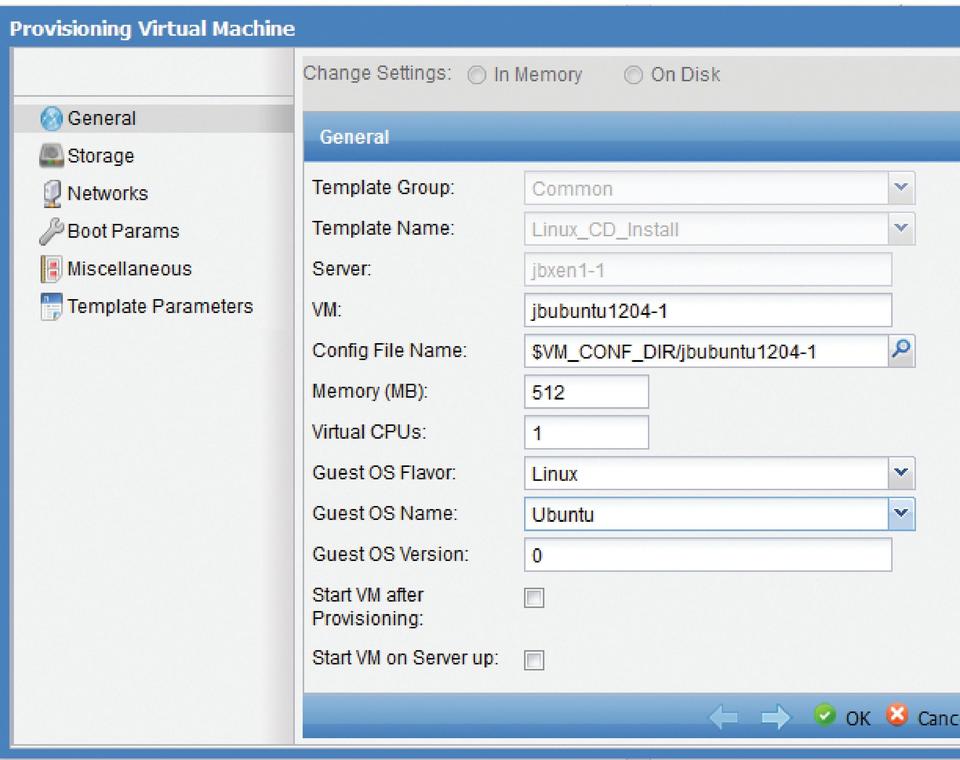 For this example setup, let's create a Linux desktop from the existing Linux CD template. After clicking on Provision, you are asked on which server to place the new guest VM, and then you're prompted to provide a name for the it (Figure 5). ConVirt then creates a guest based on your name and creates a 10GB virtual hard drive and maps the guest to the physical CD/DVD of the host on which it's provisioned.