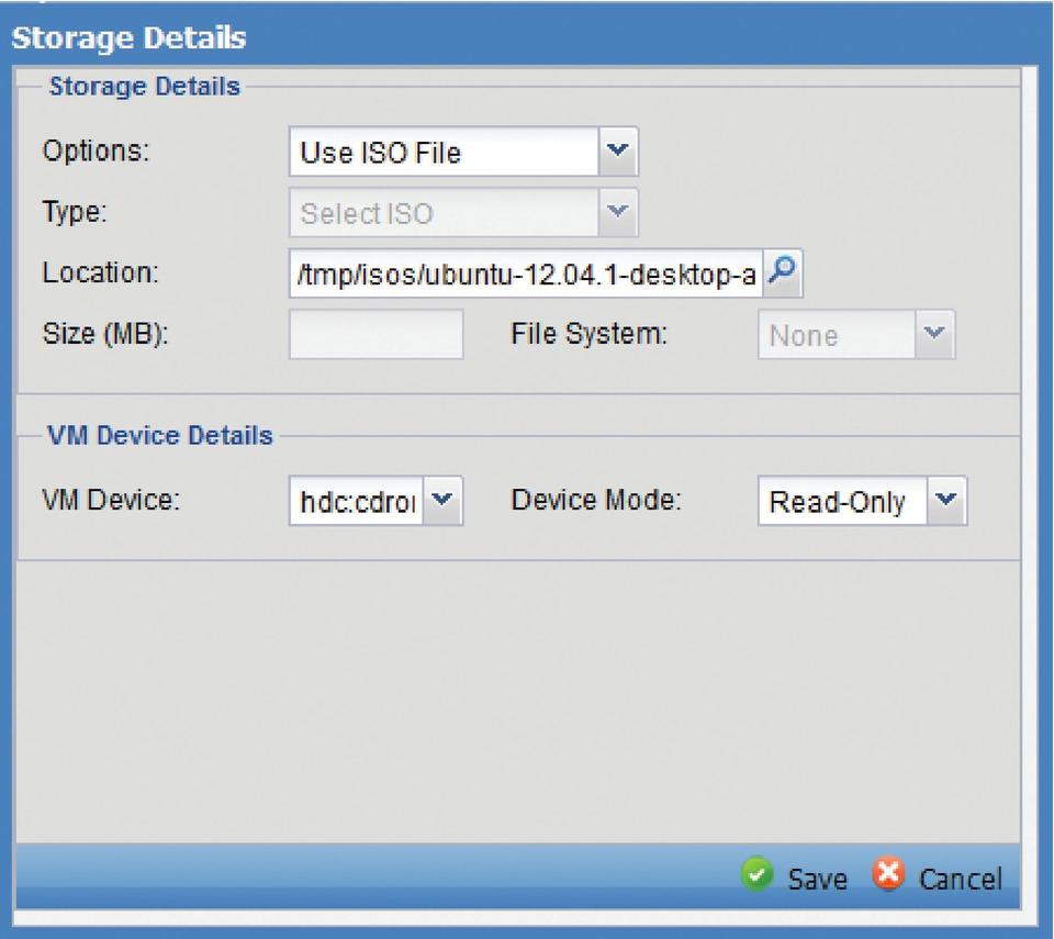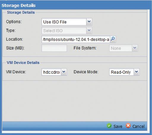 If you do not want to use CDs, you also have the option to boot from an .iso file. To do so, change the path of your /dev/cdrom to an accessible .iso file (Figure 6) in the settings of a template or the guest itself. Once the VM has been started, right-click on it and select View Console. If you have a Java-enabled browser, you can access the new VM's desktop via the Web console, or if you choose another VNC client, ConVirt will display the IP and port required to access the VM. If you prefer to administer your host via SSH, you also can launch a session from the guest's right-click context menu.
