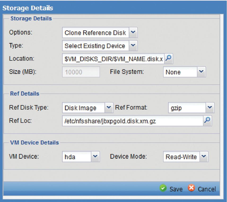 When prompted, give your template a new name. Once the new template appears in the list, right-click on it and select the Edit Settings option. Click on the Storage option and remove the existing storage defined for hda. Click on the New button at the top of the window. On the resulting window, set the Option field to Clone Reference Disk. Change the Ref. Disk Type to Disk Image and the Ref. Format to .gzip. In the Ref Loc. field, browse or enter the path to your .iso file. Change the VM Device: field to “hda”. Your settings should resemble those shown in Figure 7.