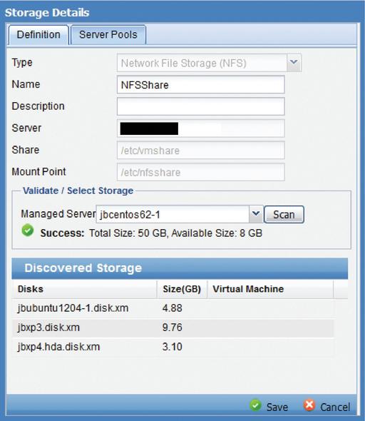 One last feature I want to mention is ConVirt's management of shared storage, because I think it is useful (Figures 8 and 9). With the designer's tree-based approach to organizing virtual resources, you set shared storage at the Data Center-level and then attach it to Server Pools, which gives you the ability to mix and match your storage among the pools. Be aware that for all servers in the pool to use the storage, they must connect to the storage using the same logical path (like migration). I found this feature incredibly useful as it really simplifies assignment of any networked storage resources you have in your environment (SAN, iSCSI or NFS). You also can set certain provisioning settings at the pool level that override those in a template. This means you can provision the same template with multiple storage options. This would be very handy if you have Server Pools in different sites or different departments, each that should use their own storage resources.