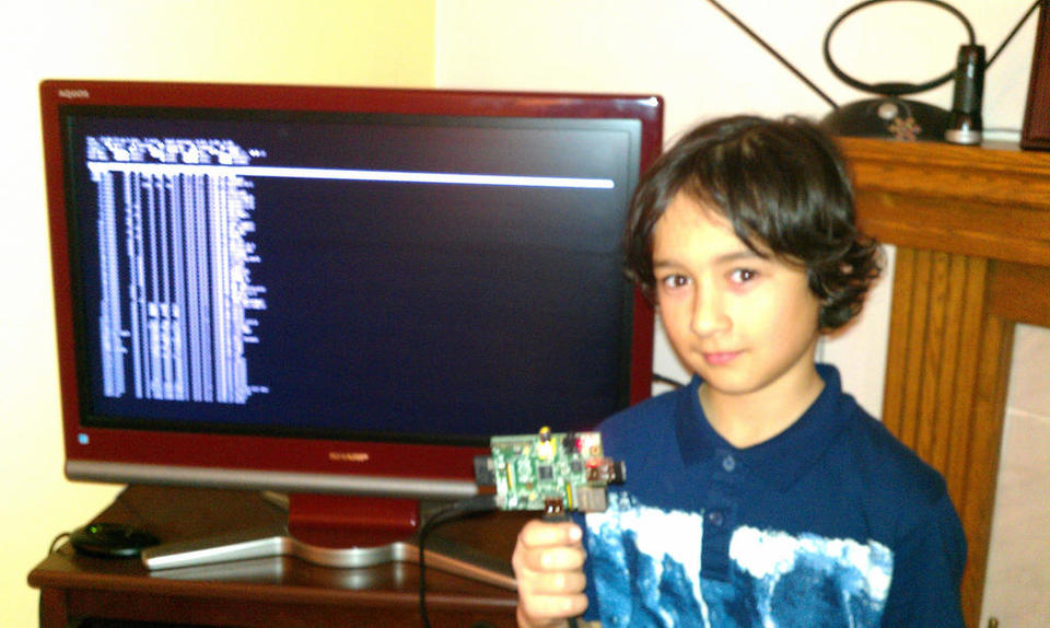 My wife bought me a Rasberry Pi for my birthday, and I thought you might get a kick out of this picture of my son holding it on its first boot. It's connected to the flatscreen, with top running in the login shell.