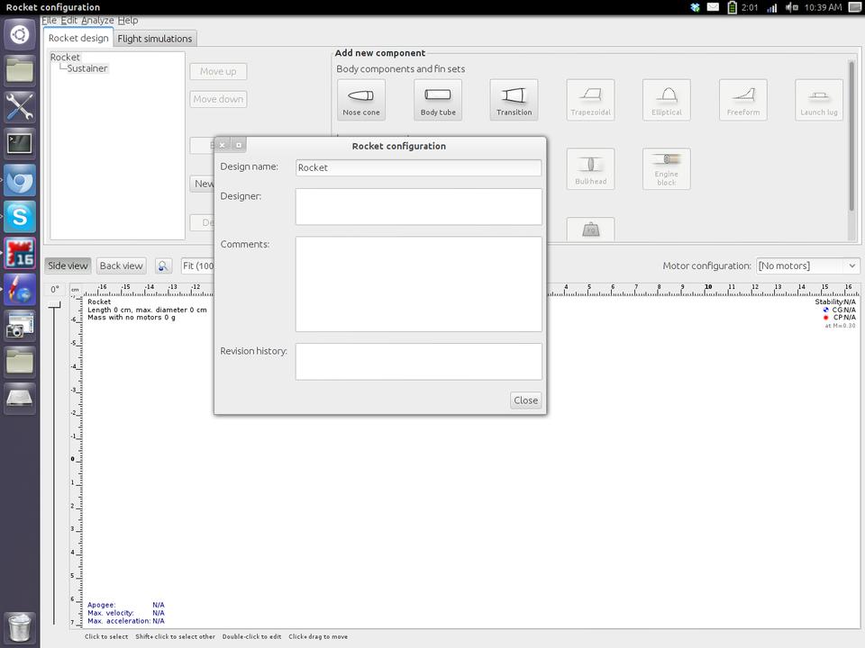 When you first start it up, you are presented with an empty screen, ready to begin designing your first rocket. A project window pops up, allowing you to enter details like the design name, your name and design notes. You can build your rocket from a series of components. You probably will want to start with the nose cone by clicking on it from the “Add new component” window. It then will appear in the bottom section, beginning your design.