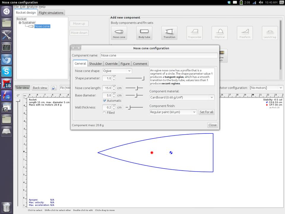What you can change will depend on which component you are trying to edit. The first component to design probably is the nose cone. You can select what kind of profile your nose cone should have, such as conical or ellipsoid. You can set the length and base diameter, as well as the wall thickness. But, OpenRocket goes even further. You can select the kind of material from which your nose cone should be made. The different types of materials have different densities, which changes the weight of your component.
