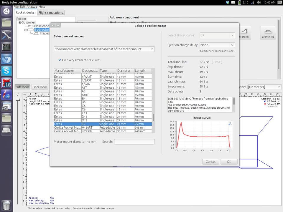 Because body tubes usually contain a rocket motor, you can set the motor that you want to use as well. To do so, open the edit window and click on the motor tab. You can click the Select Motor button and choose from a large selection of commercially available motors. This list of motors includes technical information, such as the thrust curve and the run times, as well as physical characteristics like the length, diameter and weight.