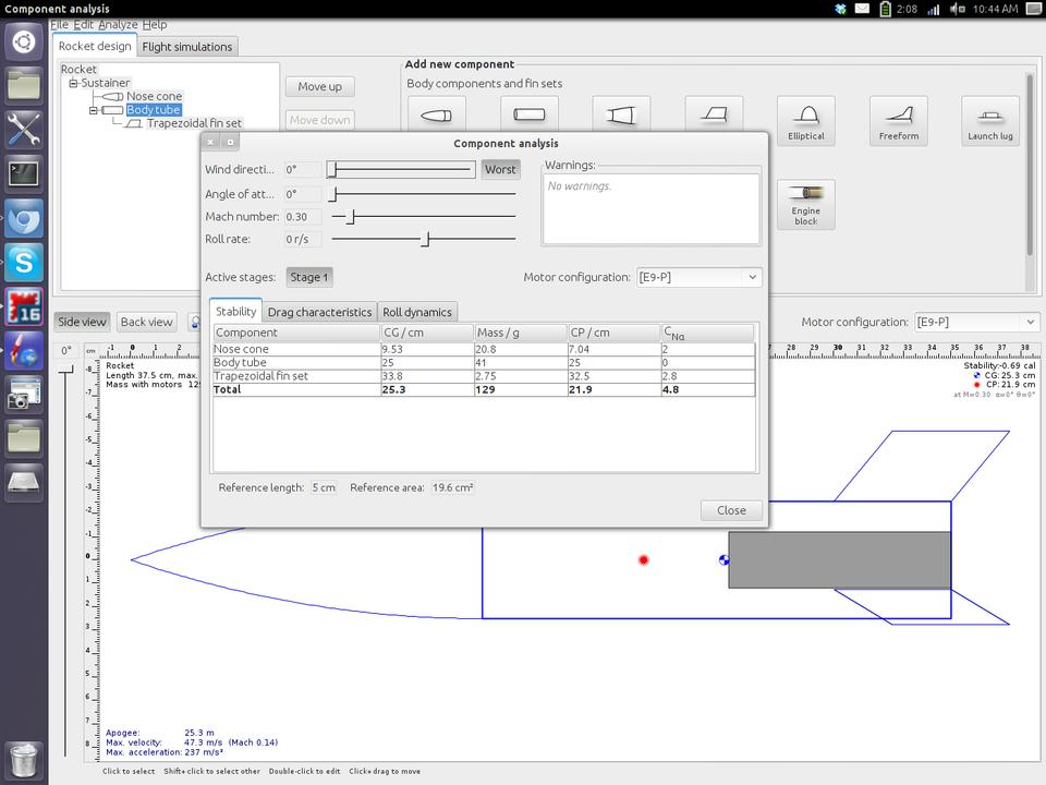 You will notice that OpenRocket already begins to make calculations based on your design. You will see a small blue circle that denotes the center of gravity of your rocket. The center of gravity is the point through which all of the mass acts. There also is a small red dot that marks the center of pressure. This is the point through which all of the atmospheric forces act. OpenRocket calculates these values as you make changes to your design.