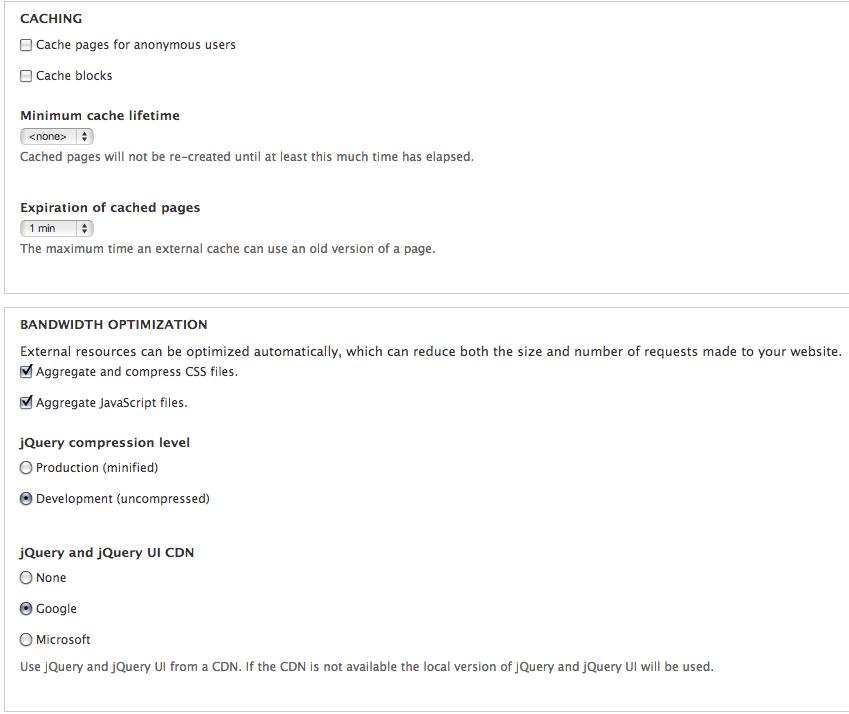 Figure 5. Drupal Core's Performance Administration Screen for Caching, File Aggregation, jQuery and jQuery UI CDN