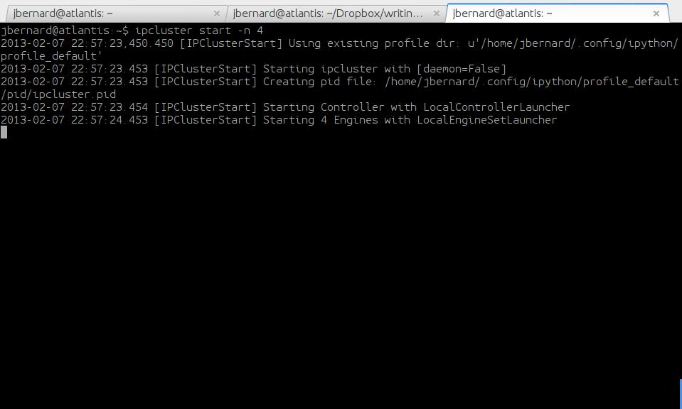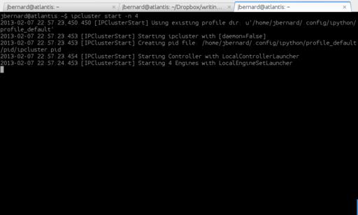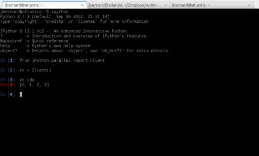 Once you get your four engines started, they are available when you start IPython. You will need to do this in another terminal window, because ipcluster still will be running in the original terminal. After importing the parallel module, you can create a Client object to interact with the engines created by ipcluster: