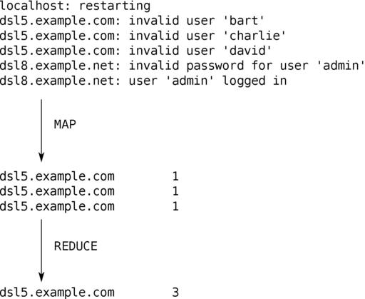 Let's dive a little deeper. What exactly does map.py do? It transforms unstructured log data into tab-separated key-value pairs. It emits a hostname for a key, a tab and the number 1 for a value (again, only for lines with “invalid user” messages). Note that any number of log lines could be fed to any number of instances of the map.py program—each line can be examined independently. Similarly, each output line of map.py can be examined independently.