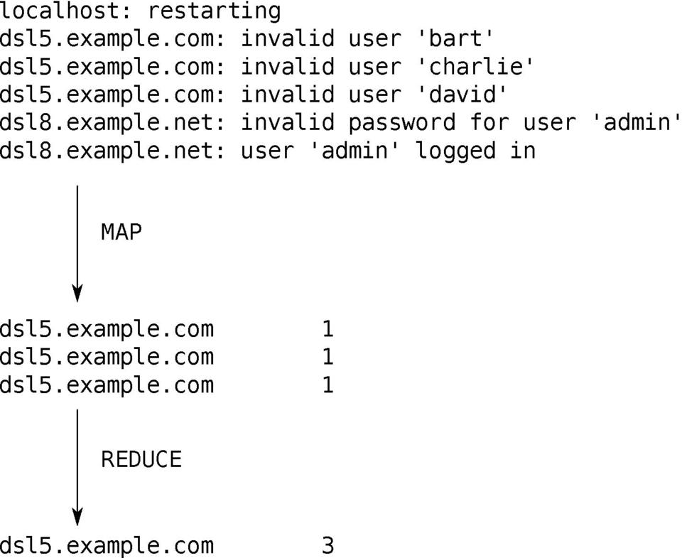 The log format is hostname, colon, message. Your boss suspects someone evil is trying to brute-force attack the application. The same host trying many different user names may indicate an attack. He wants totals of “invalid user” messages grouped by hostname. Filtering the above log lines should yield: