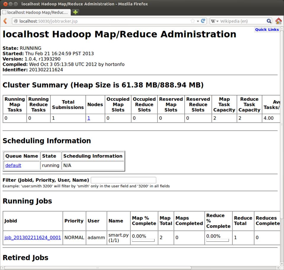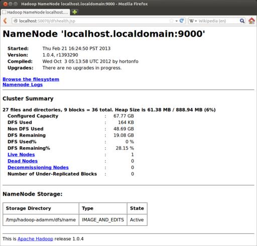 If you set up pseudo-distributed (or distributed) Hadoop, you'll gain the benefit of two spartan-but-useful Web interfaces. The NameNode Web interface allows you to browse logs and browse the Hadoop distributed filesystem. The JobTracker Web interface allows you to monitor MapReduce jobs and debug problems.