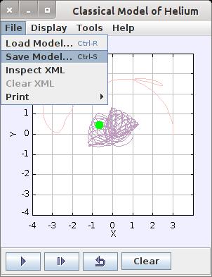 Some of the simulations provided by Open Source Physics have parameters that you can alter to change the runtime details of the simulation. These parameters might be items like masses, velocities or field strengths. If the simulation you are using does have settable parameters, there will be an option to save the model details off to a data file. You can do this by clicking File→Save Model. The data file is an XML file, so it should be relatively clear if you want to edit the file directly with a text editor. You then can reload these parameters in the simulation by clicking File→Load Module. This way, you can share models you've developed with other people by sharing the XML data file.