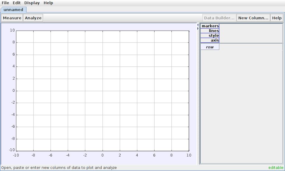 The Open Source Physics project provides two other tools: Data Tool and Tracker. First, let's look at Data Tool. Data Tool provides plotting and data-fitting functions to help you analyze experimental data. You can change the appearance of plots interactively by selecting parameters on the main screen. Once your data is loaded, Data Tool also can do basic statistics on the data set. So, you quickly can get items like mean, median and standard deviation. With your data plotted, you can get the slope and area under curves in the plot. Often, you collect data to try to demonstrate some relationship between inputs and outputs. To verify this, you try to fit some function to your data. Data Tool provides a number of predefined functions that you can ask it to try to fit. Or, you can use Fit Builder to define your own functions to be used in the fitting routine. You also may find that you need to massage your data before either plotting it or trying to fit it. This may involve applying different types of mathematical transformations to your data. In regular data analysis, this would be a step you would handle before importing your data, but Data Tool provides a function called Data Builder that allows you to do this right here.
