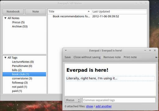 Although Everpad has a fairly spartan-looking interface, its deep integration with Unity makes it quite impressive. Thankfully, Everpad doesn't require Unity to work, and in my Xubuntu environment, it works quite nicely. Due to its power and flexibility, Everpad is this month's Editors' Choice. For instructions on installing it into your Linux environment, check out its wiki at https://github.com/nvbn/everpad/wiki/how-to-install.