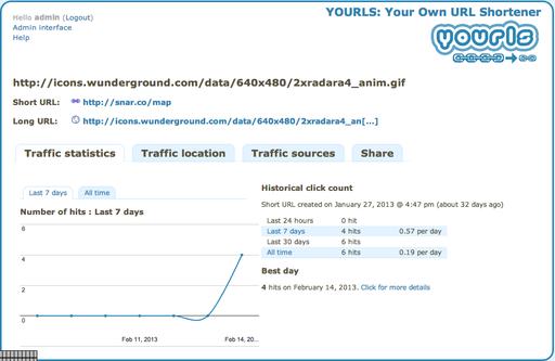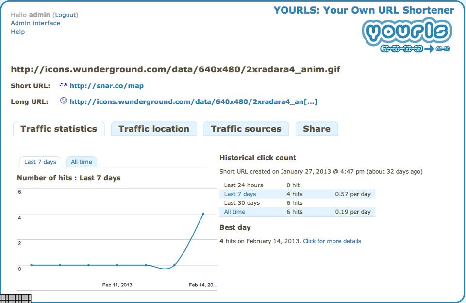 Once you have YOURLS set up, and you've shortened all the URLS you can imagine shortening, the next cool thing to check out is the stats. Much like bit.ly, with YOURLS you can open the stats page for a particular link by adding a + to the end of the short URL. So for Figure 4, I simply surfed to snar.co/map+, and after logging in, I got to look at all the glorious clicks I've received. The information is quite useful if you're looking for how popular your particular shared URLs have become. As mentioned above, the statistics YOURLS generates are quite extensive.