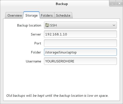 From the client Linux machine, launch the backup utility, choose “SSH” as the backup location, and enter the RPi's IP address and the storage location you just created. The first backup will be slow, but future runs will be sending only incremental changes, which is significantly faster.