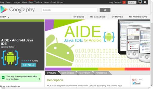 The first step is to install AIDE on your Android device. Open up the Play Store and do a search for “AIDE”. The appropriate package should show up at the top of the list. If you are in doubt, verify that the developer is “appfour GmbH”. AIDE takes up more than 12MB, so if you are running short on space, you can transfer the majority of it to an SD card, leaving 4.45MB in your device's main storage.