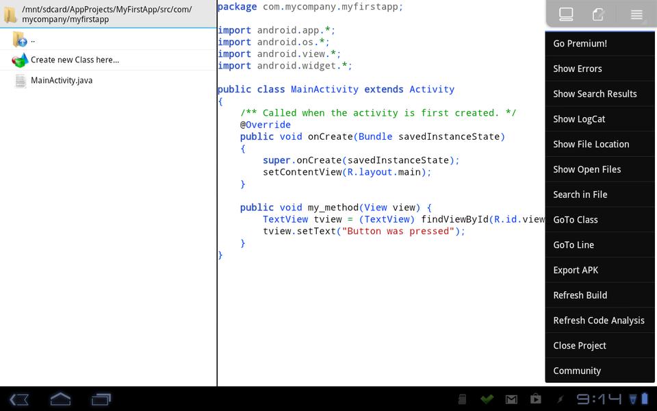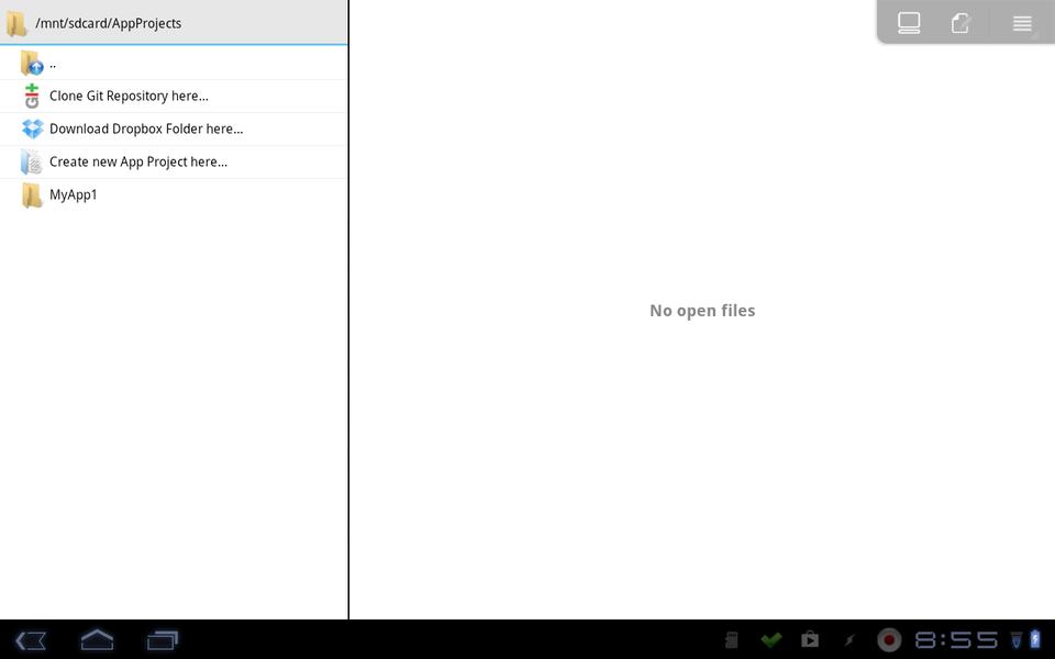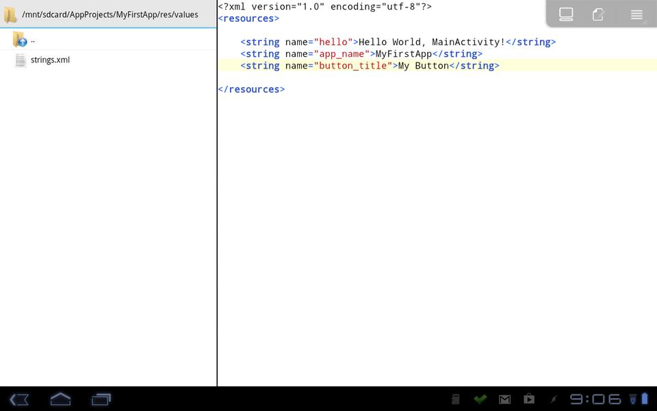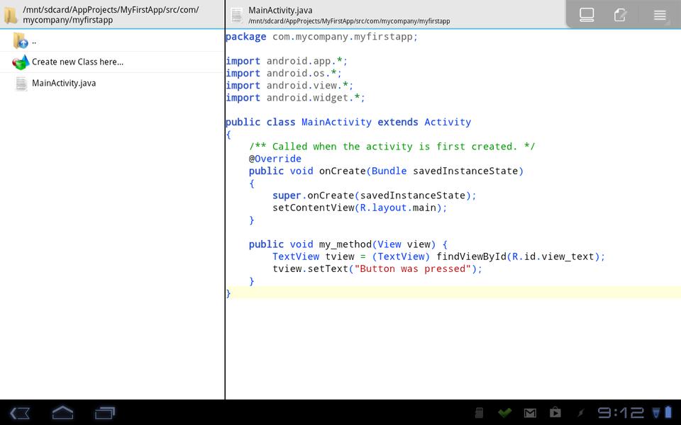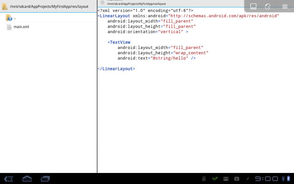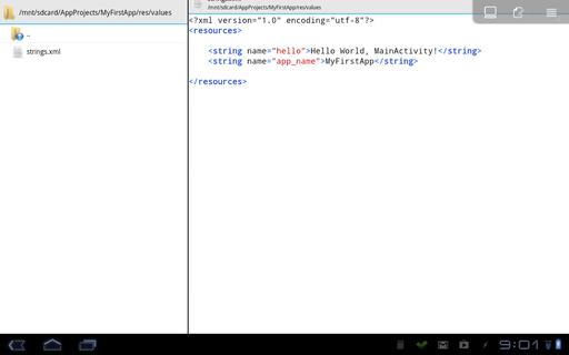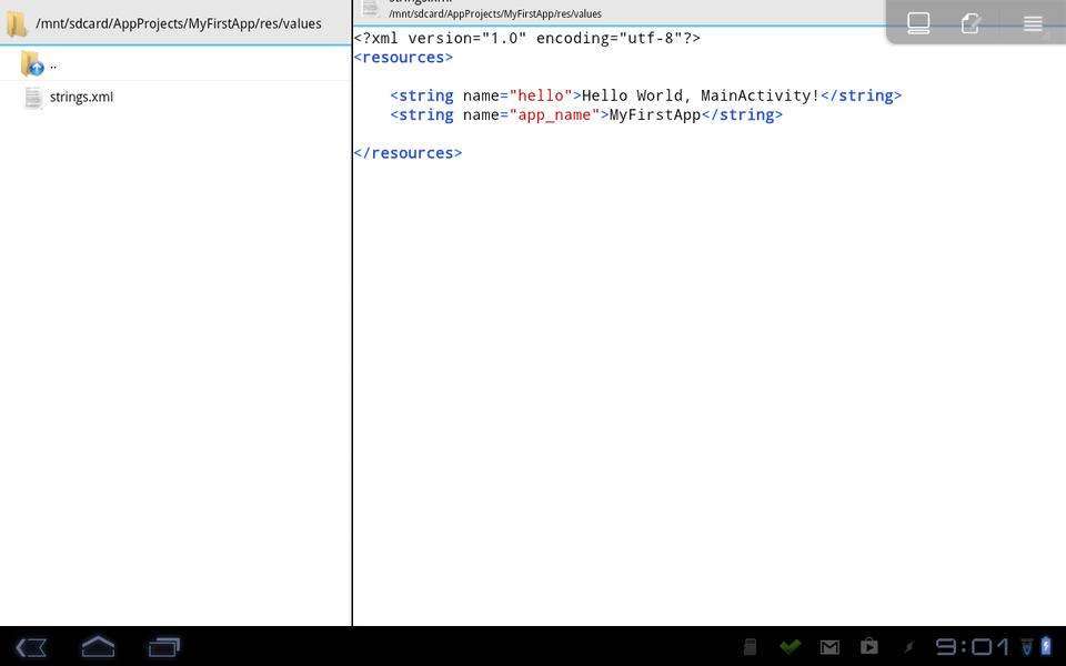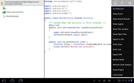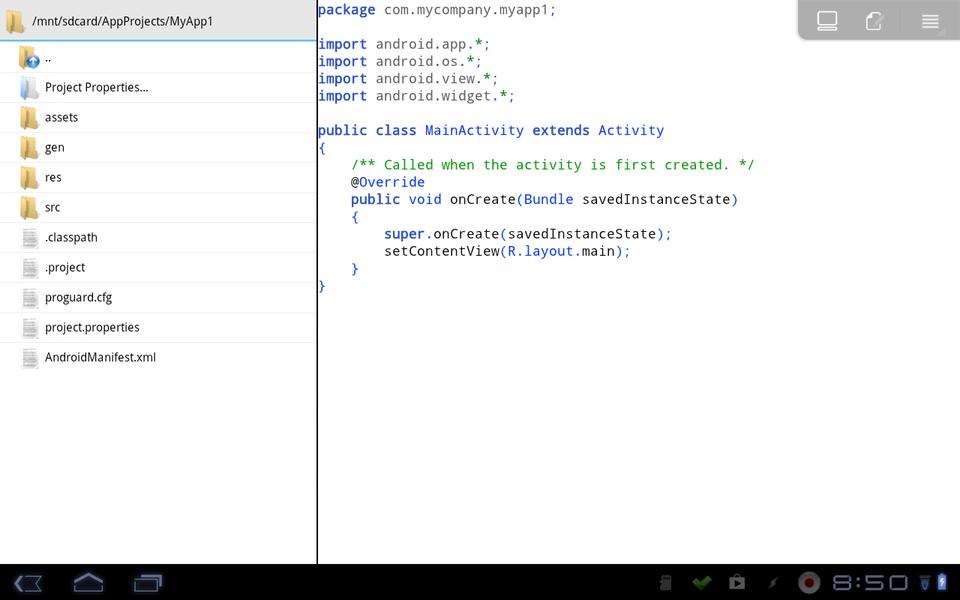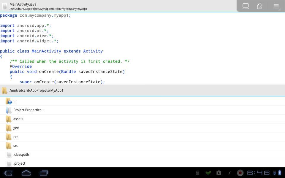 Once you click create, the files will be created in the folder /mnt/sdcard/appname (where appname is the name you gave your project), and this new project will be opened up in the IDE. The main part of the IDE consists of two panes. Their alignment depends on the size of the device on which you're running it. On my phone, the panes are one above the other, and on my tablet, the panes are side by side. The first pane is a file listing for your project, containing all the properties, resources and source files needed for an Android project. The second pane is the main editor, where the central file (MainActivity.java) gets loaded on project creation.