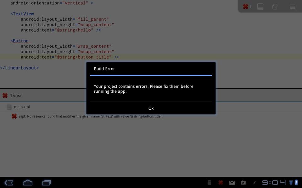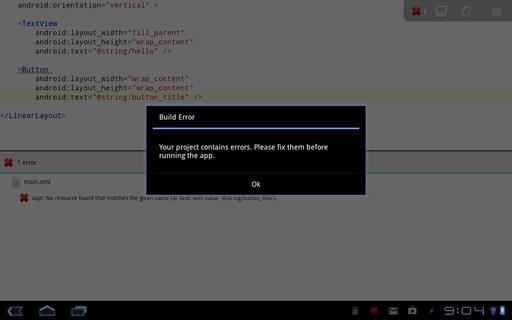 Once you add the above, you can click the menu button, select More, and then select Refresh Build. This will try to do a full rebuild of your app, and you will see an error about the missing string resource. If you have multiple errors, clicking on the error in the list will bring you to the location where the error appears. To fix this particular error, you need to add the following text to the file res/values/strings.xml:
