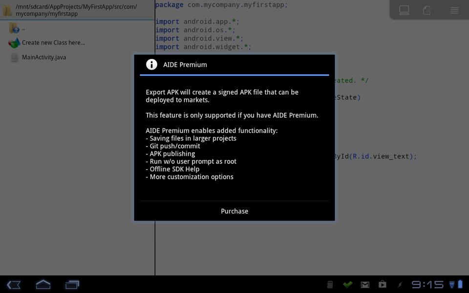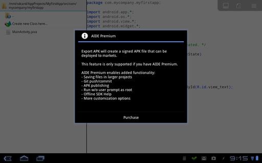 But, there may be times when you want to develop on the road or shorten the cycle by developing on your Android device itself. One of the better options for this is AIDE, the Android Java IDE. AIDE is distributed under a freemium model. The free version allows you to develop, compile and run your code. It also allows you to install to the device on which AIDE is running. However, if you want to generate APK files that can be used to install onto other devices, you need to purchase the full version.