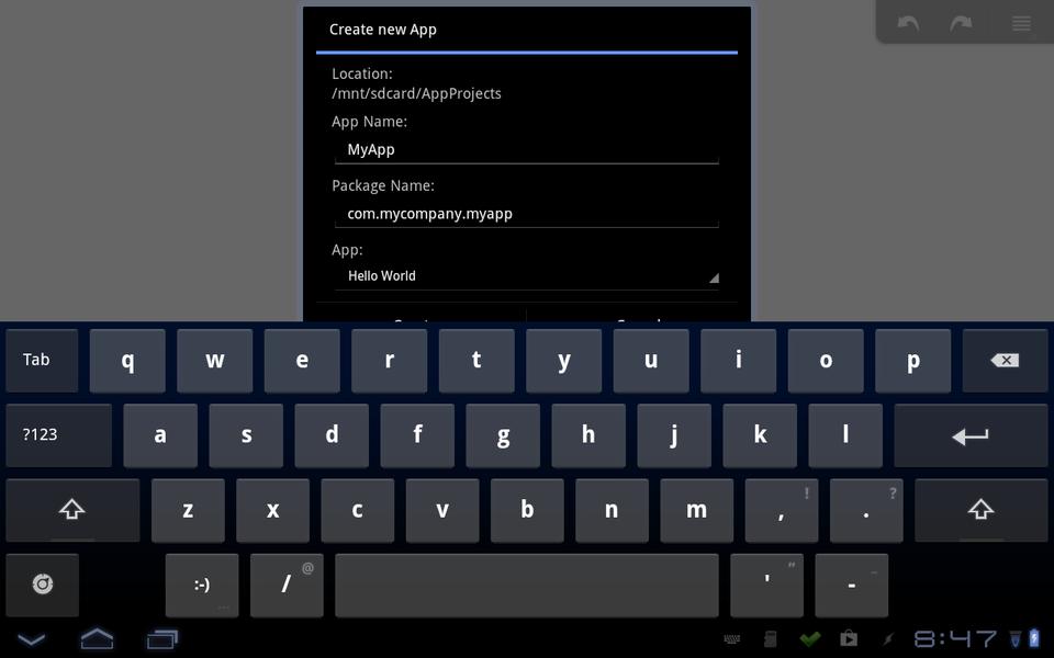 The very first time you start AIDE, it will pop up a dialog box where you can enter the details for beginning a project. In this dialog, you can enter an App Name and a Package Name. You also can select an app template from some built-in ones, such as “Hello World”, “Tetris” and “Analog Clock Widget”. These templates will set up the folders and files for your new project.