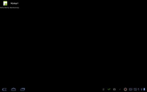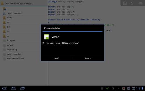 If you start with one of the templates, you can compile it and run it right away to see how the process works. Click on the menu button, and select the Run option. This will pop up a dialog, informing you of each step being done. It will compile your code, link it and create an APK file. In order to run it, this APK file needs to be installed. So an installation dialog will appear asking if you want to install it. Once installed, it then will start up, and you will have your very first Android application, developed completely on Android.